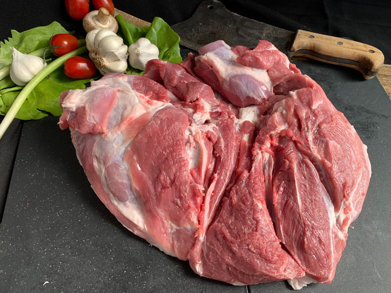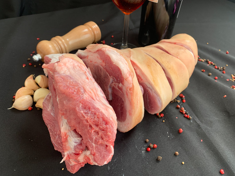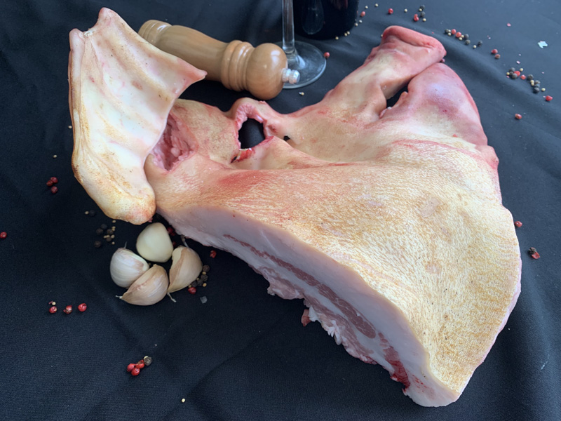 A könnyebb kezelhetőség és szállítás miatt öt darabba vágjuk – fej, első comb, oldalát kettőbe vágjuk a szűzpecsenye előtt, hátsó comb.