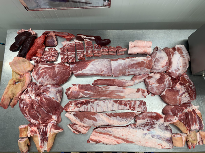 A húst kérés szerint feldolgozzuk: például csontozzuk a lapockát, szeleteljük a tarját és a karajt, vagy daráljuk a dagadót – minden úgy készül el, ahogyan a vásárló szeretné.